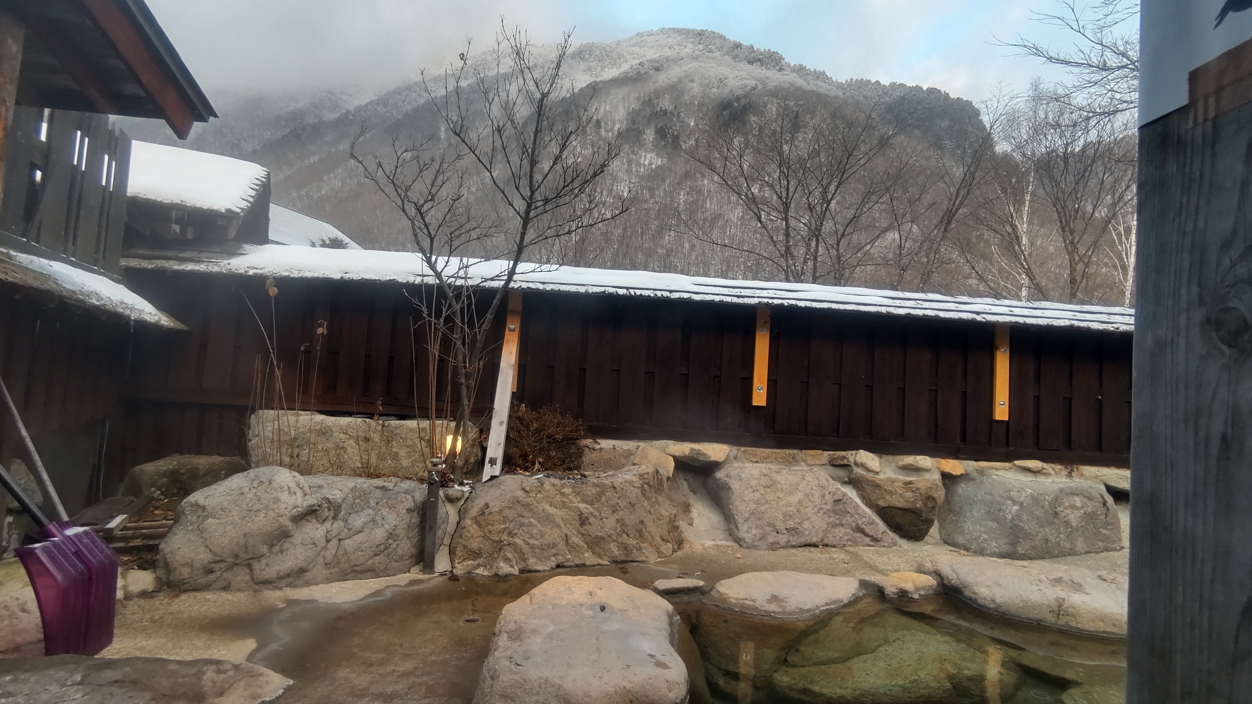 | 本日(2025/12/31)の宿。 | 宿の反対側。焼岳方面から白い噴煙… |