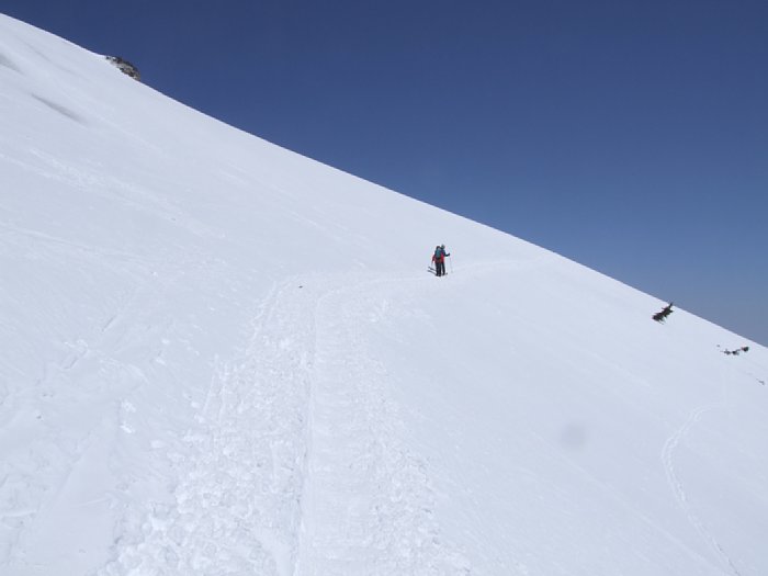 小至仏直下のトラバース(2009/04/29 10:09:52) 前を行くのは山スキーヤー。山スキーの轍で出来たトラバース道を慎重に辿る。 カリカリのアイスバーンだと滑落したら面倒な感じだが、そうではないので気は楽。しかし、高度感はある。 |