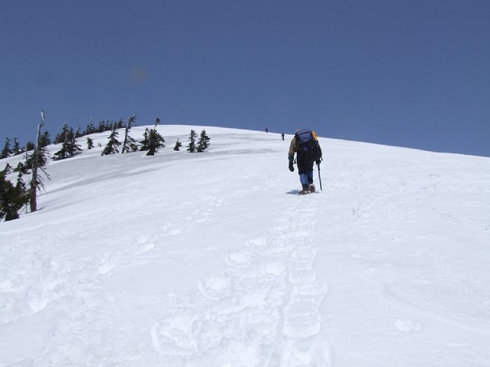 ススケ峰手前の登り(2009/04/30 6:30:57) 雪の上とはいえ、冷え込むことも無く快適に眠ることが出来た。 朝は遅めの5時前に起床。棒きれおじさんと若干話をしたら、先にススケ峰を目指して出発。 ススケ峰はこのピークを越えた先。前日の3人組の踏み跡を辿る。踏み跡以外にスキーの跡 (一人か二人?)もある。スキー跡は平ヶ岳・景鶴山間にもあり、見ることは無かったが スキーヤーが既に足跡を残している。 |